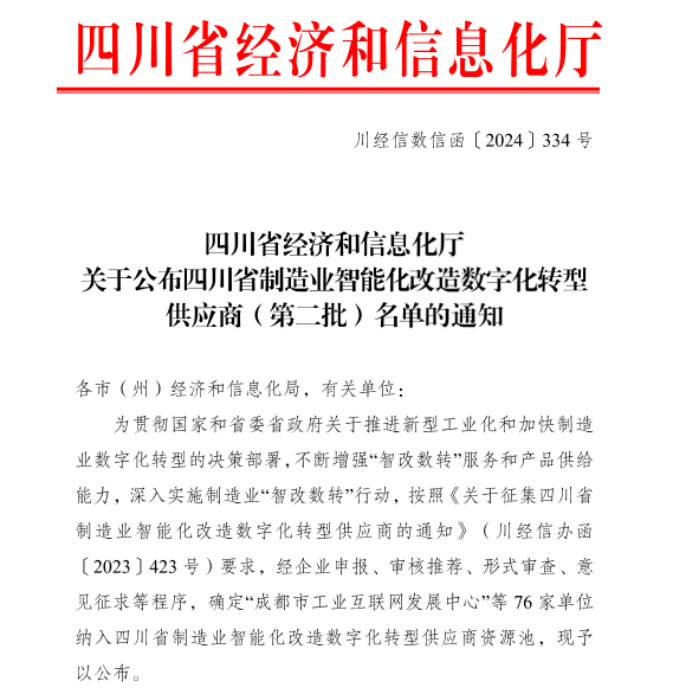 2024年6月17日,四川省經(jīng)濟(jì)和信息化廳公布了《四川省制造業(yè)智能化改造數(shù)字化轉(zhuǎn)型供應(yīng)商(第二批)名單》,川投信產(chǎn)所屬川投數(shù)科(全稱:四川川投智勝數(shù)字科技有限公司,原全稱:四川川大智勝系統(tǒng)集成有限公司)(以下簡(jiǎn)稱“川投數(shù)科(原簡(jiǎn)稱:智勝集成)”)成功入圍“系統(tǒng)集成服務(wù)商”資源池。