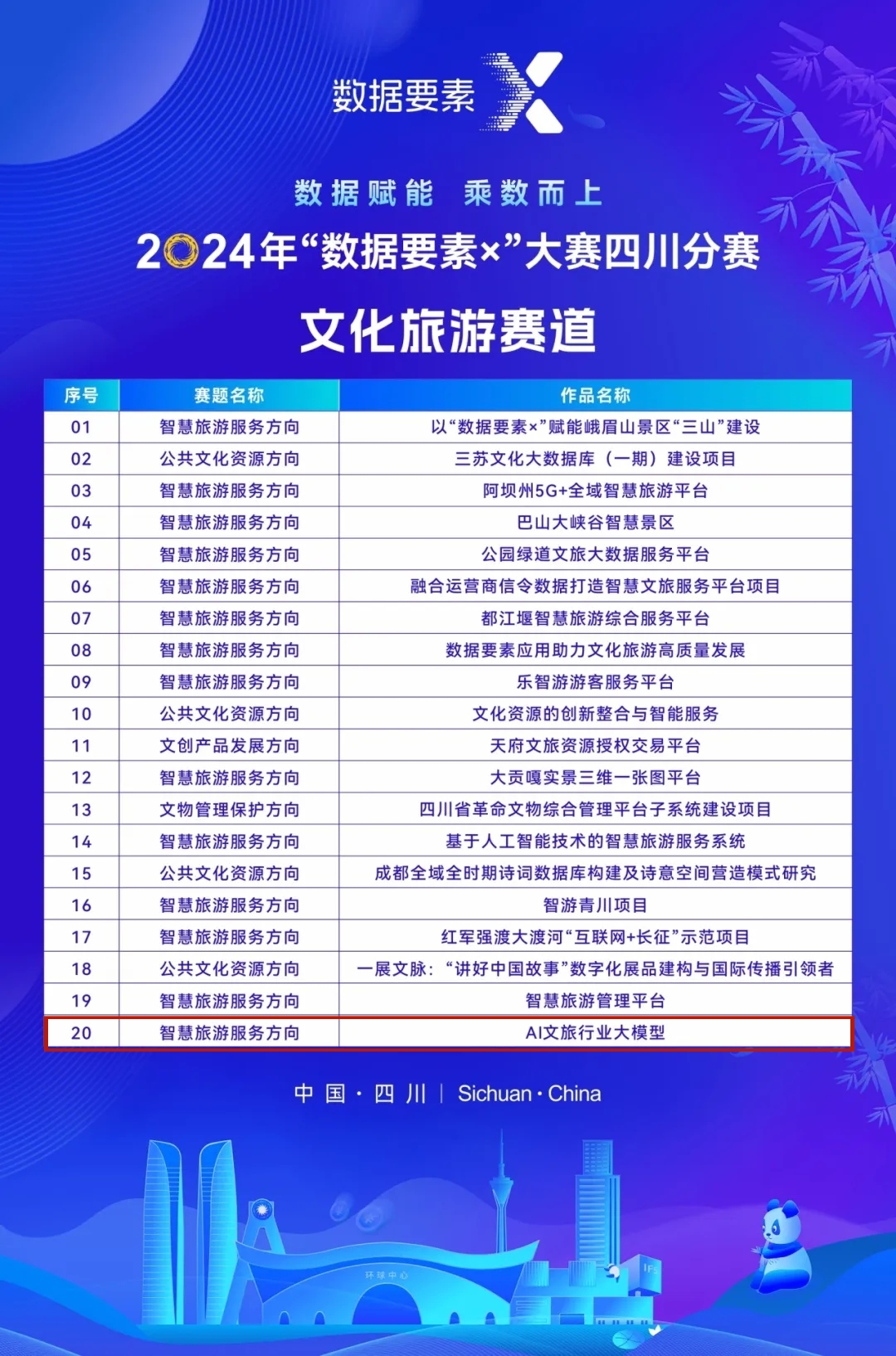 8月27日,由國家數(shù)據(jù)局、四川省人民政府指導,省發(fā)展改革委(省數(shù)據(jù)局)、達州市人民政府等單位共同主辦的2024年“數(shù)據(jù)要素×”大賽四川分賽決賽名單公布,川投數(shù)科(原簡稱:智勝集成)智旅數(shù)創(chuàng)團的“AI 文旅行業(yè)大模型”項目成功入圍“數(shù)據(jù)要素x”文化旅游賽道智慧旅游服務(wù)方向決賽名單。