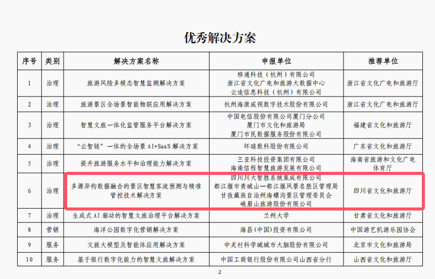 ? 近日,文化和旅游部辦公廳公布了“2024年全國(guó)智慧旅游解決方案名單”。通知中提出,為深入貫徹黨的二十屆三中全會(huì)精神,扎實(shí)推進(jìn)《“十四五”旅游業(yè)發(fā)展規(guī)劃》明確的以數(shù)字化、網(wǎng)絡(luò)化、智能化為特征的智慧旅游發(fā)展,落實(shí)《智慧旅游創(chuàng)新發(fā)展行動(dòng)計(jì)劃》,根據(jù)《文化和旅游部辦公廳關(guān)于組織開(kāi)展2024年全國(guó)智慧旅游解決方案推薦遴選工作的通知》,在自愿申報(bào)、各地文化和旅游行政部門(mén)及相關(guān)行業(yè)協(xié)會(huì)推薦的基礎(chǔ)上,經(jīng)專家評(píng)審和社會(huì)公示,文化和旅游部最終確定了10個(gè)“2024年全國(guó)智慧旅游十佳解決方案”和20個(gè)“2024年全國(guó)智慧旅游優(yōu)秀解決方案”。其中,川投信產(chǎn)所屬川投數(shù)科(全稱:四川川投智勝數(shù)字科技有限公司,原全稱:四川川大智勝系統(tǒng)集成有限公司)的“多源異構(gòu)數(shù)據(jù)融合的景區(qū)智慧客流預(yù)測(cè)與精準(zhǔn)管控技術(shù)解決方案”成功入選優(yōu)秀解決方案。