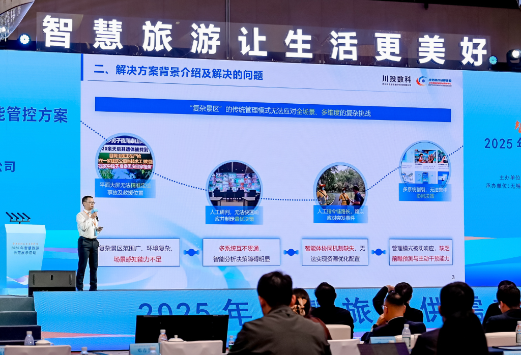 10月28日至29日,由文化和旅游部資源開發(fā)司與江蘇省文化和旅游廳、無(wú)錫市人民政府共同主辦的“2025年智慧旅游示范展示活動(dòng)”在江蘇無(wú)錫隆重舉行。作為智慧旅游領(lǐng)域的年度盛會(huì),本次活動(dòng)以“智慧旅游讓生活更美好”為主題,展示智慧旅游發(fā)展成果,推動(dòng)示范引領(lǐng)和供需對(duì)接,進(jìn)一步推動(dòng)《智慧旅游創(chuàng)新發(fā)展行動(dòng)計(jì)劃》落地見(jiàn)效。四川川投智勝數(shù)字科技有限公司(以下簡(jiǎn)稱“川投數(shù)科”)憑借“基于文旅大模型智能體與數(shù)字孿生的景區(qū)全場(chǎng)景虛擬映射模型與智能管控方案”,再次驚艷亮相,成為行業(yè)焦點(diǎn)。作為四川能源發(fā)展集團(tuán)旗下所屬川投信息產(chǎn)業(yè)集團(tuán)有限公司控股的技術(shù)型領(lǐng)軍企業(yè),川投數(shù)科連續(xù)三年受邀參會(huì),其路演的創(chuàng)新實(shí)踐案例獲得了專家團(tuán)隊(duì)高度認(rèn)可,成為行業(yè)標(biāo)桿案例。